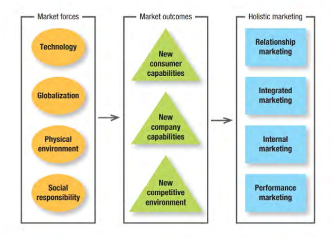 ခေတ်သစ်ဈေးကွက်ရဲ့ ရှုပ်ထွေးတဲ့ ပြောင်းလဲမှုတွေမှာ အောင်မြင်ဖို့အတွက် ကုမ္ပဏီတွေဟာ သမားရိုးကျ ဈေးကွက်ရှာဖွေမှုနည်းလမ်းတွေထက် ပိုမိုကျယ်ပြန့်ပြီး ဘက်စုံတဲ့ ချဉ်းကပ်မှု လိုအပ်ပါတယ်။ Holistic Marketing ဆိုတာက ဈေးကွက်ရှာဖွေရေးလုပ်ငန်းတွေအားလုံးဟာ တစ်ခုနဲ့တစ်ခု ဆက်စပ်နေပြီး အပြန်အလှန် မှီခိုနေတယ်လို့ ယူဆတဲ့ အယူအဆတစ်ခုပါ။ ဒါဟာ ကုမ္ပဏီတစ်ခုလုံးမှာရှိတဲ့ ဌာနတိုင်း၊ လုပ်ဆောင်မှုတိုင်းဟာ ဖောက်သည်တန်ဖိုး (customer value) ကို ဖန်တီးပေးဖို့ ပူးပေါင်းဆောင်ရွက်ရမယ်ဆိုတဲ့ သဘောတရားကို အခြေခံပါတယ်။