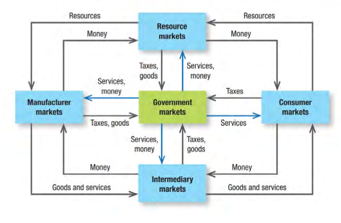 - ဒီဈေးကွက်ကတော့ ဗဟိုအစိုးရ၊ ဒေသဆိုင်ရာအစိုးရနဲ့ အစိုးရအဖွဲ့အစည်းတွေဟာ သူတို့ရဲ့လုပ်ငန်းဆောင်တာတွေအတွက် လိုအပ်တဲ့ ကုန်ပစ္စည်းနဲ့ ဝန်ဆောင်မှုတွေကို ဝယ်ယူတဲ့နေရာပါ။